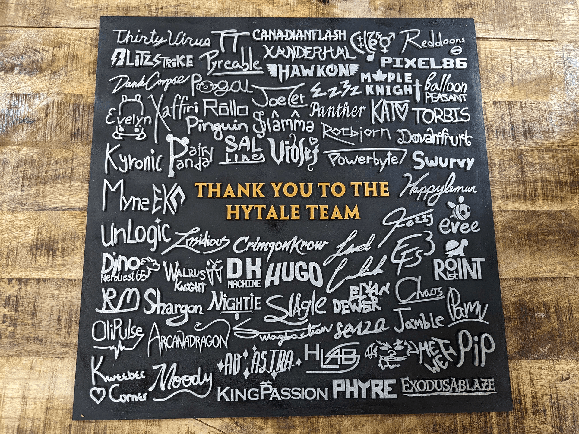 This is true year-round, but a few weeks ago we received an incredible gift – a beautifully-carved board signed by creators from all parts of the Hytale community. I wanted to take a moment to say thank you on behalf of the entire team to everyone involved in making this happen.