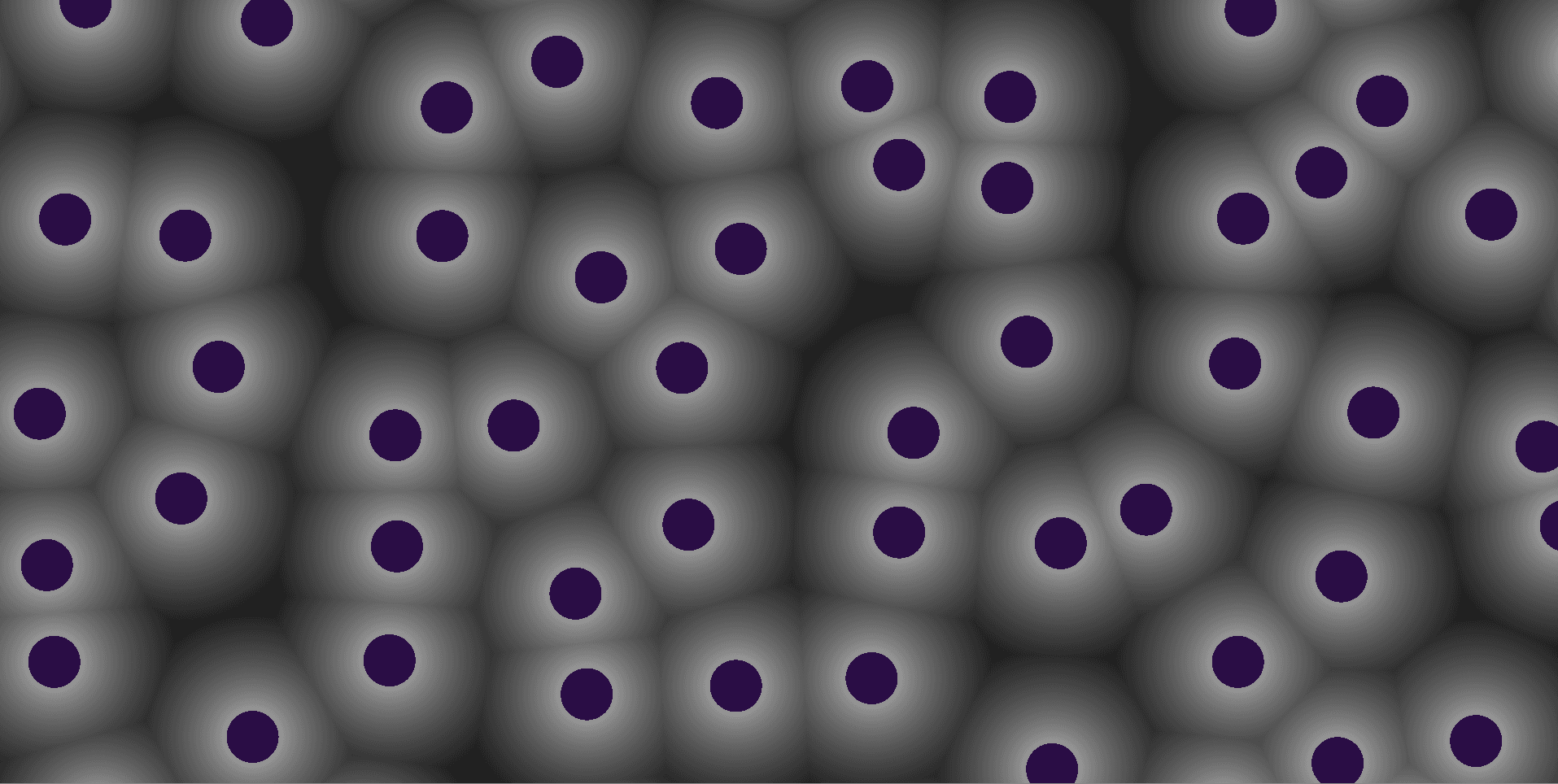This is an example of Voronoi noise, which creates cell-like patterns. For Hytale, we use these 'cells' to establish where large prefabs can and can't occur. In the image above, the purple spots represent areas where a large prefab might be encountered, and collectively account for about 20% of the generated space. If we wished, we could increase or reduce this density.