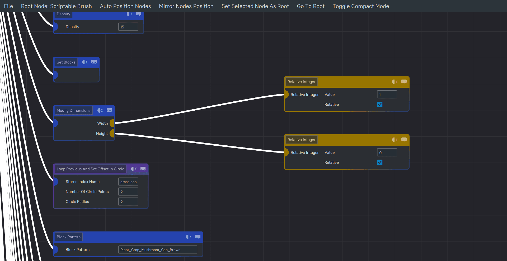 The first thing that I do in the video is take out some of the Scripted Brushes that ship with Hytale. These are simple asset-defined brushes that any modder or user can create more of. Simply drag and drop them into your inventory to create mountains, grassy paths, procedurally generated ruins, and more! You can even edit these scripted brushes in the Hytale Node Editor.