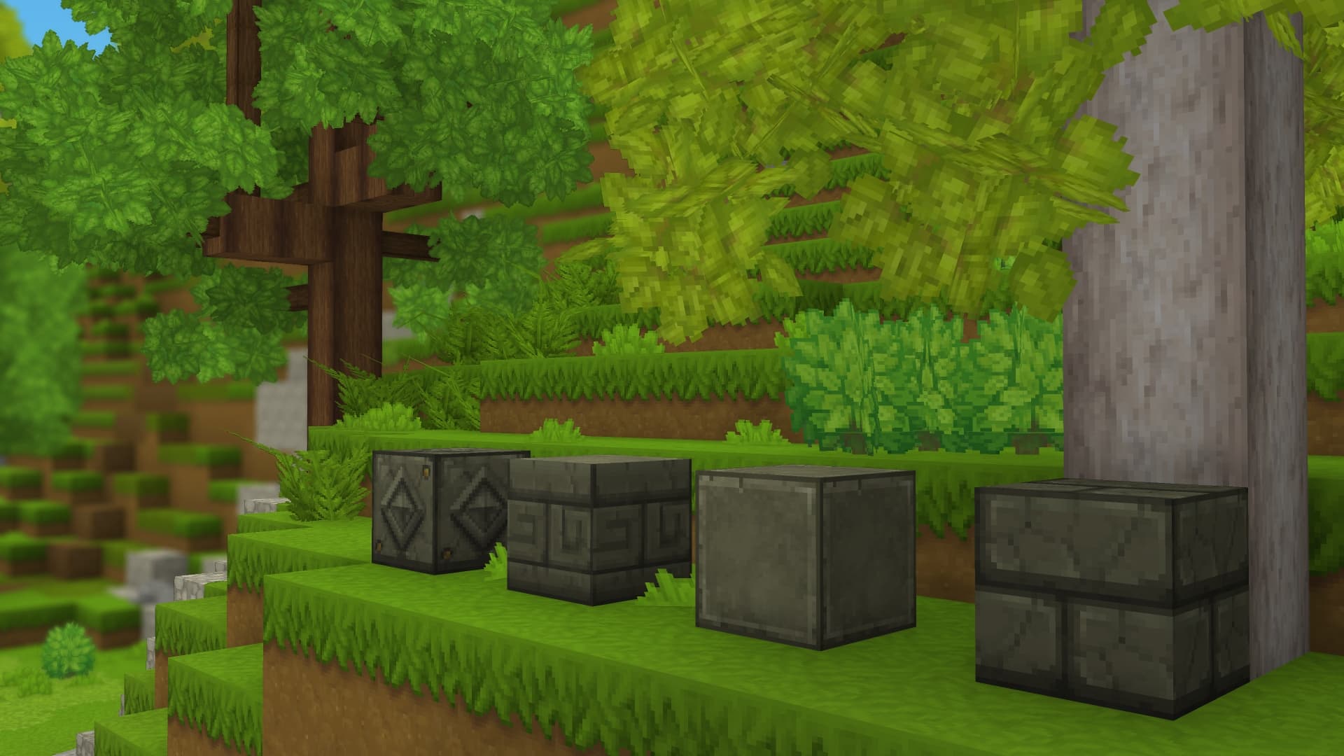 These four blocks are each derived from the same basic stone material. Having multiple designs allows you to customize your builds with various textures and finishes.