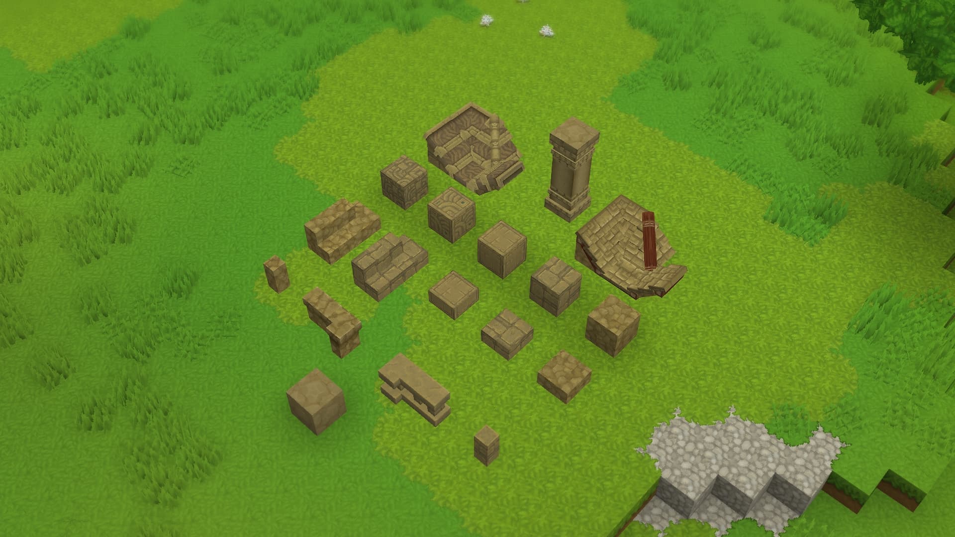 In the image above, you can see many of the different building blocks that you can create out of quartzite, as well as multiple texture variations for each. In addition to regular blocks, you can also see roof blocks, stair blocks, wall blocks, pillars, slabs, and beams. Keep reading to find out more about how each of these are used!