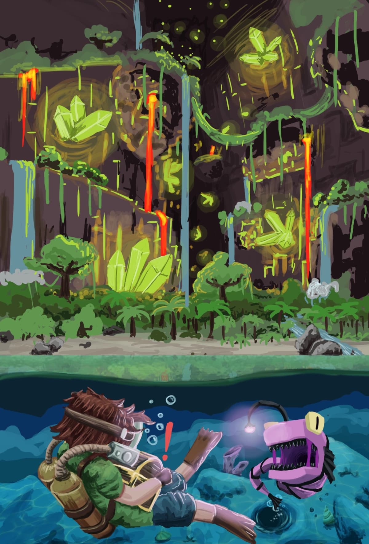 This piece of art was inspired by a part of Hytale seen in our World Gen Introduction - the underground lakes and forests beneath zone 4. We like how Roko has taken an environment glimpsed in a piece of concept art and fleshed it out with their own ideas. The startled explorer at the bottom is a nice touch too, providing a sense of the adventures that might be waiting at the bottom of the world.