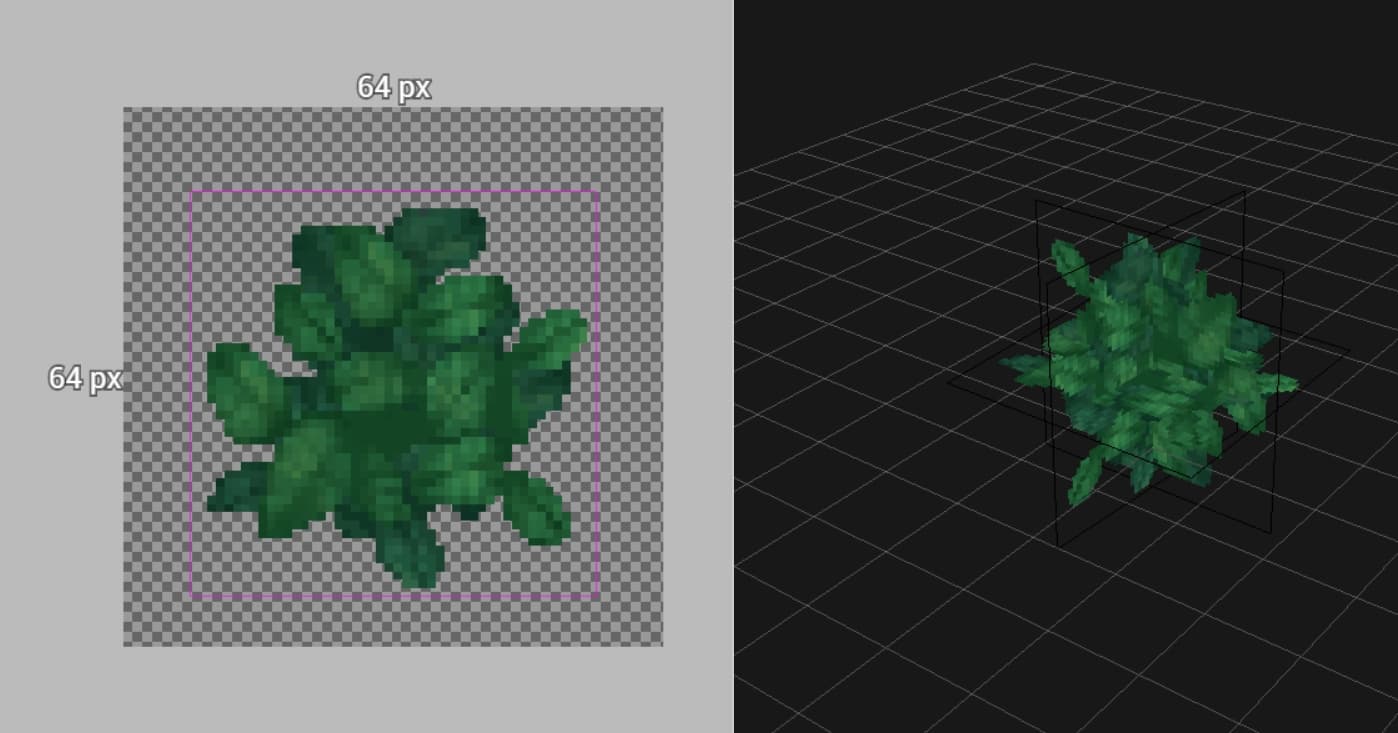 Note how the leaf texture bisects the block from multiple angles, rather than appearing on the outer surface of the cube. This immediately helps the block to feel less ‘blocky’ - but we go one step further. Every time a leaf block is placed, we rotate it to create a sense of random leaf placement.