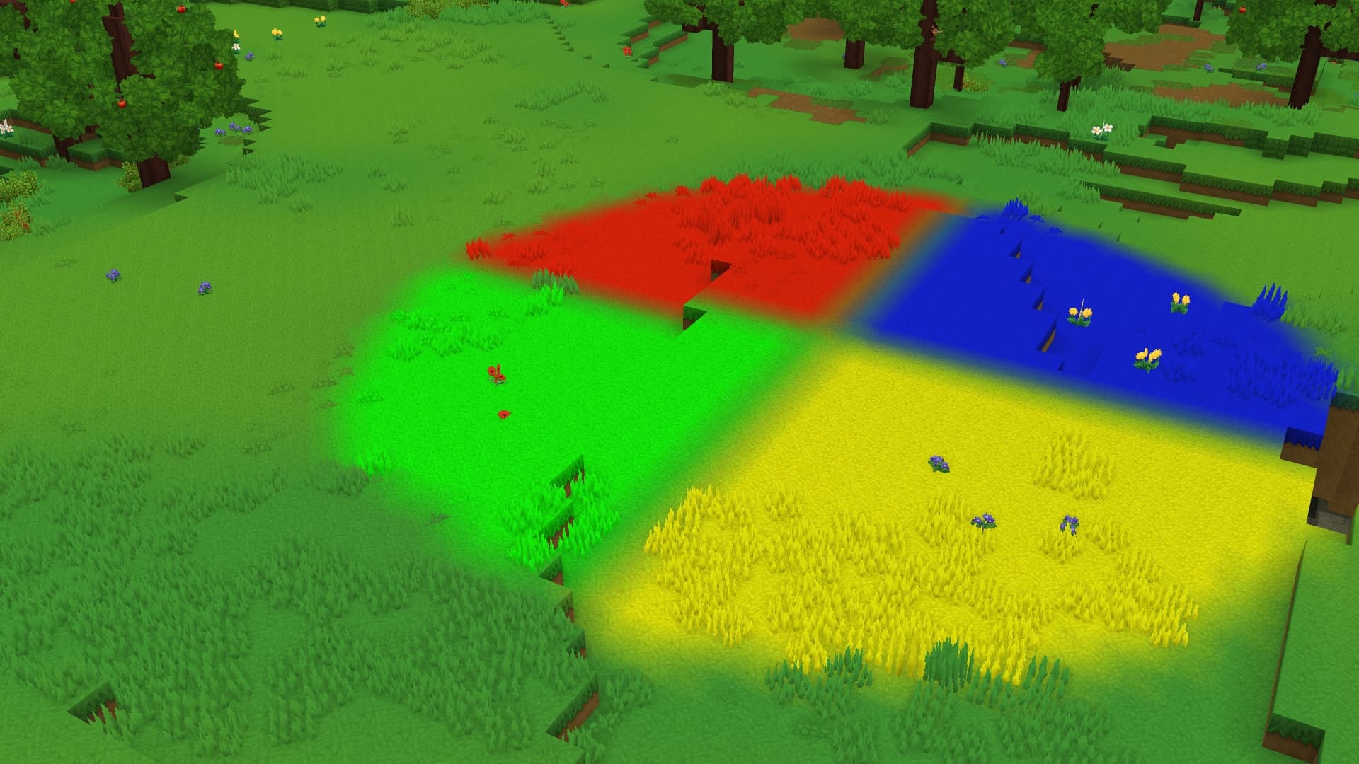 Hytale’s creative tools can be used to change the RGB tint of any block. By changing the red, green, and blue properties of a texture, you can dynamically change its color. Above, you can see an extreme example of this technique: the ground is composed of the same basic grass block, but different areas have had their RGB balance shifted to the extremes.
