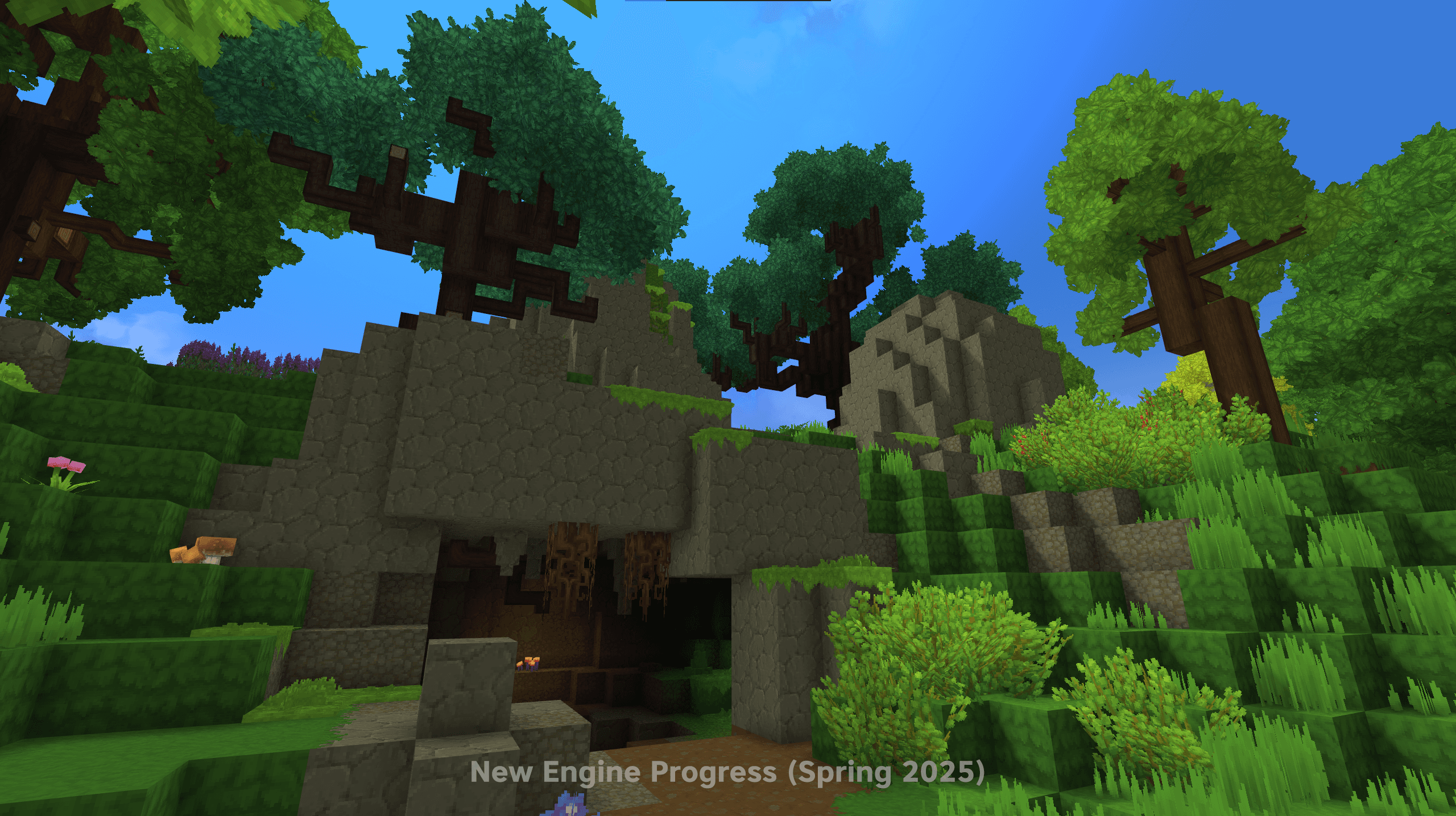 In the next clip, we explore the same scene – and the area around it – in Creative Mode, showing off an early version of our new flying animations before landing and stepping into a cave.