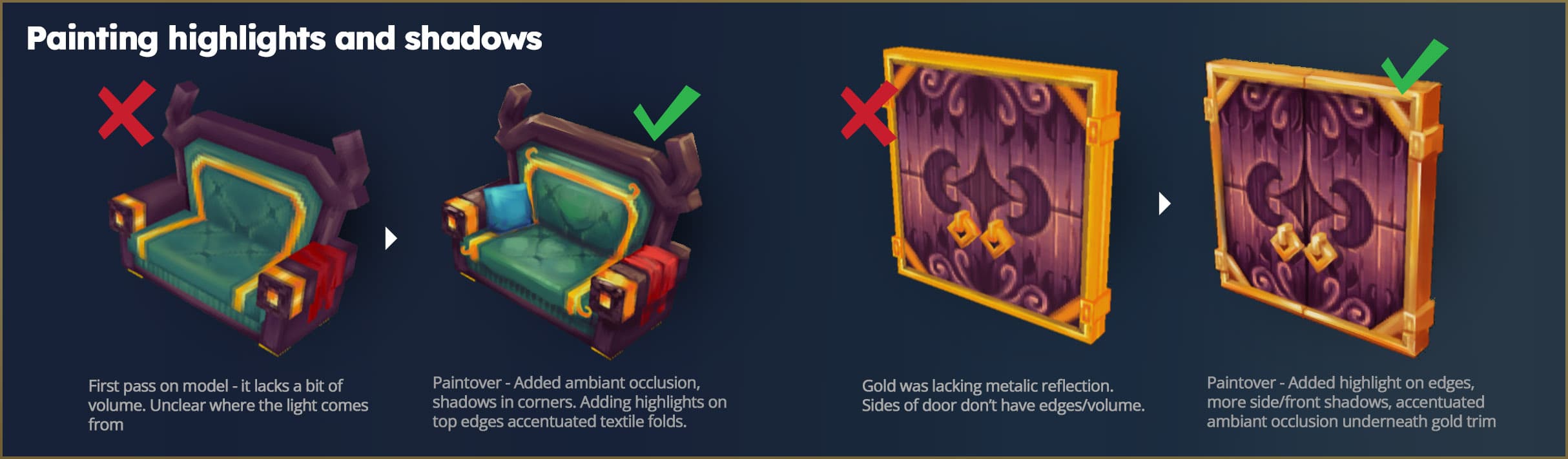 - We paint lights and shadows inside textures and use real lights/shadows to bring everything together.