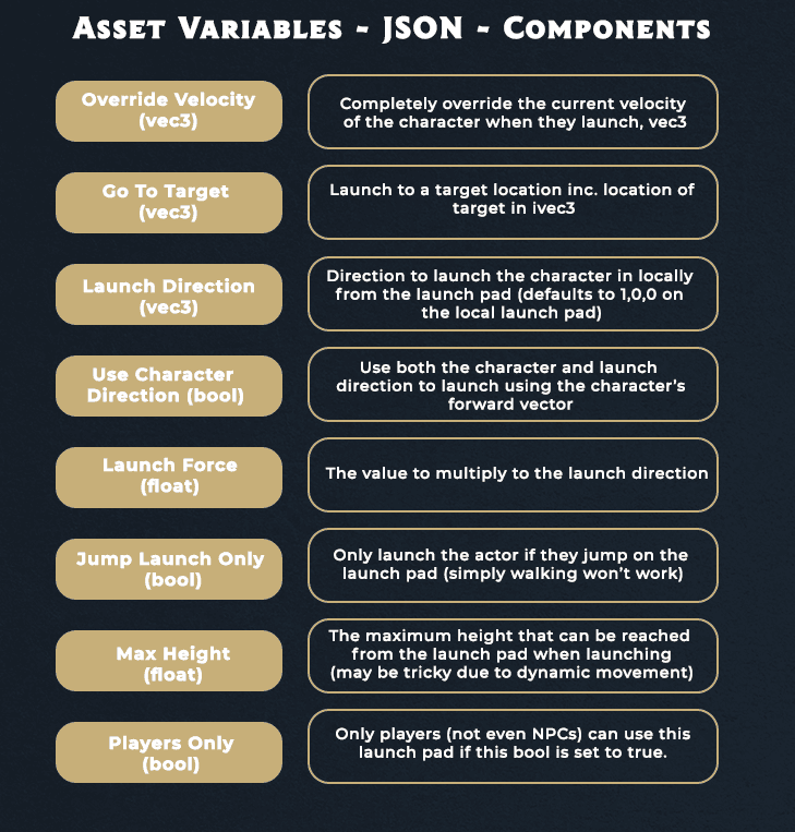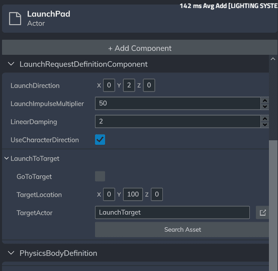 This board included the primary physics functionality and API required to create the launch pad feature itself, as well as some basic exposed variables for design to tinker with.
