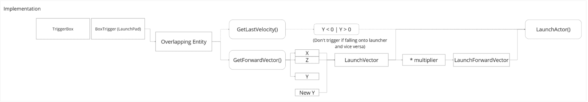 At their core, launch pads are an actor in a world with a trigger collider . When objects (such as players) overlap with the trigger, an event is fired that applies a configurable impulse to the target. This sends that object–the target–flying through the air. In other words, they’ve been launched .