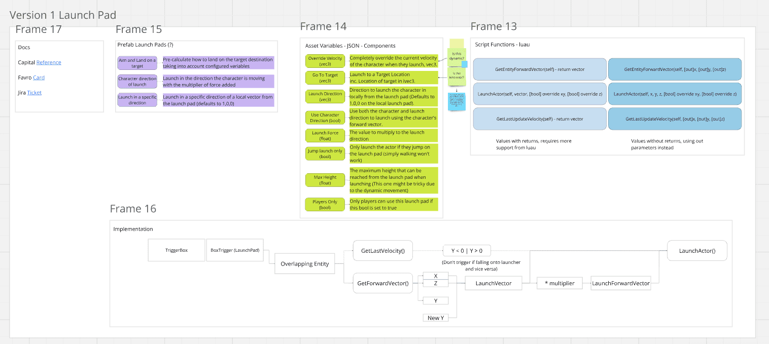 When we were first tasked with creating launch pads, my first thought was, “Well, it’s a launch pad! Most games have them, it’ll probably be the same as everywhere else.” Despite this initial impression, I leaned on our values of collaboration and spoke to the designer on point at the very start to understand their perspective. The next steps were reading through the design spec, speaking about it in our weekly public design huddle, gathering clarifications from design, and building out a Miro board.