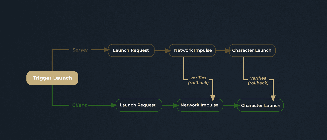 Dealing with server-authoritative movement is a vital part of launch pad development. A physics impulse must be applied by the server, and the velocity and launch vector is calculated and resolved there. The client predicts and resolves its position through the same calculations. This physics impulse is only known at the time of the launch, as each launch pad could be configured to aim in a different direction–or require the character’s forward vector to calculate the velocity.